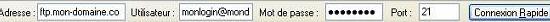 - Adresse: entrez ici le nom de votre serveur FTP, par exemple : ftp.mon-domaine.com - Utilisateur: entrez ici "votre-login@votre-nom-de-domaine.com". - Mot de passe: entrez ici votre mot de passe. - Port: le port utilisé est le port 21. Votre fenêtre devrait maintenant ressembler à celle-ci :
