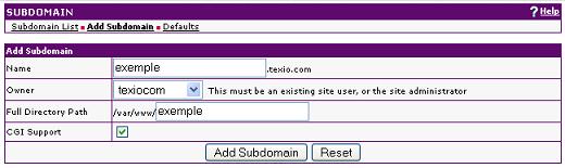 Comment créer une sous domaine ? Dans votre panneau de configuration, allez dans "Subdomains" -> "Add Subdomain", entrez le nom de celui-ci et le nom du repertoire vers lequel il pointera. Le repertoire et le sous domaine n'ont pas forcement le même nom. Par défaut le "owner" (propriétaire) est le compte administrateur mais vous pouvez en choisir un autre, par exemple un utilisateur qui a un acces FTP.