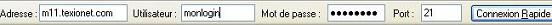 - Adresse: entrez ici le nom de votre serveur FTP, par exemple : ftp.mon-domaine.com - Utilisateur: entrez ici votre login. - Mot de passe: entrez ici votre mot de passe. - Port: le port utilisé est le port 21. Votre fenêtre devrait maintenant ressembler à celle-ci :