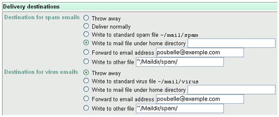 Comment contrôler les virus et le spam de mes boites mails ? Dans votre zone d'administration, allez dans "Mels Virtuels" > "Server Details" puis "Spam and Virus Delivery". Vous avez alors plusieurs options.
